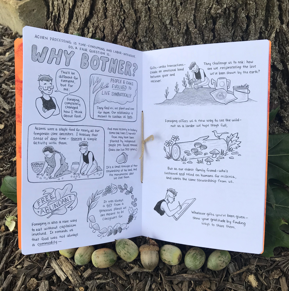 "Eating Acorns" is a 20 page instructional comic about harvesting, preparing, and cooking with one of our most abundant wild foods: acorns! Perfect for beginning foragers, this will walk you through the process step-by-step, with easy instructions and a collection of simple recipes you can try out.